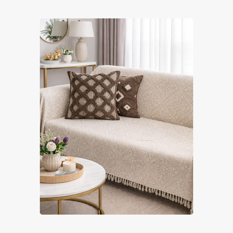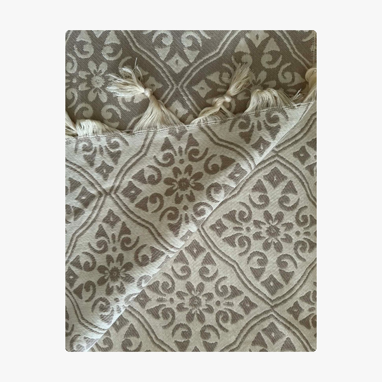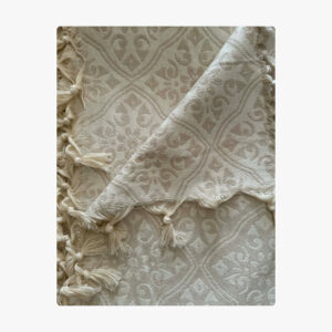 Ce jeté en tissage jacquard double face offre une finition haut de gamme, idéale pour rehausser votre intérieur. Son motif élégant en beige avec lurex combine raffinement et confort.